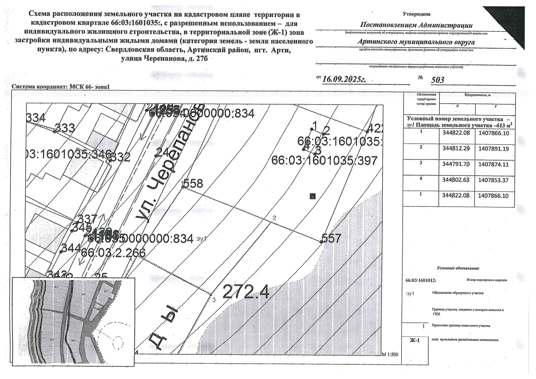 - для индивидуального жилищного строительства по адресу: Свердловская область, Артинский муниципальный округ, пгт Арти, ул. Шутова, д. 47, с кадастровым номером 66:03:1601028:26, площадью 517 кв.м. схема