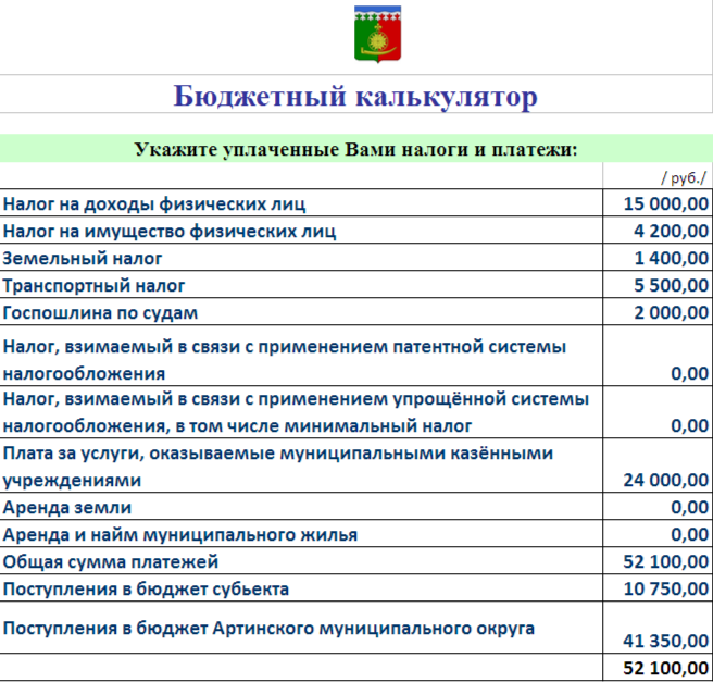 С помощью данного бюджетного калькулятора вы можете рассчитать свой вклад в доход местного бюджета, а также наглядно увидеть, на какую сферу деятельности были направлены уплаченные вами в виде налогов денежные средства и как денежные средства будут распределены в текущем году.