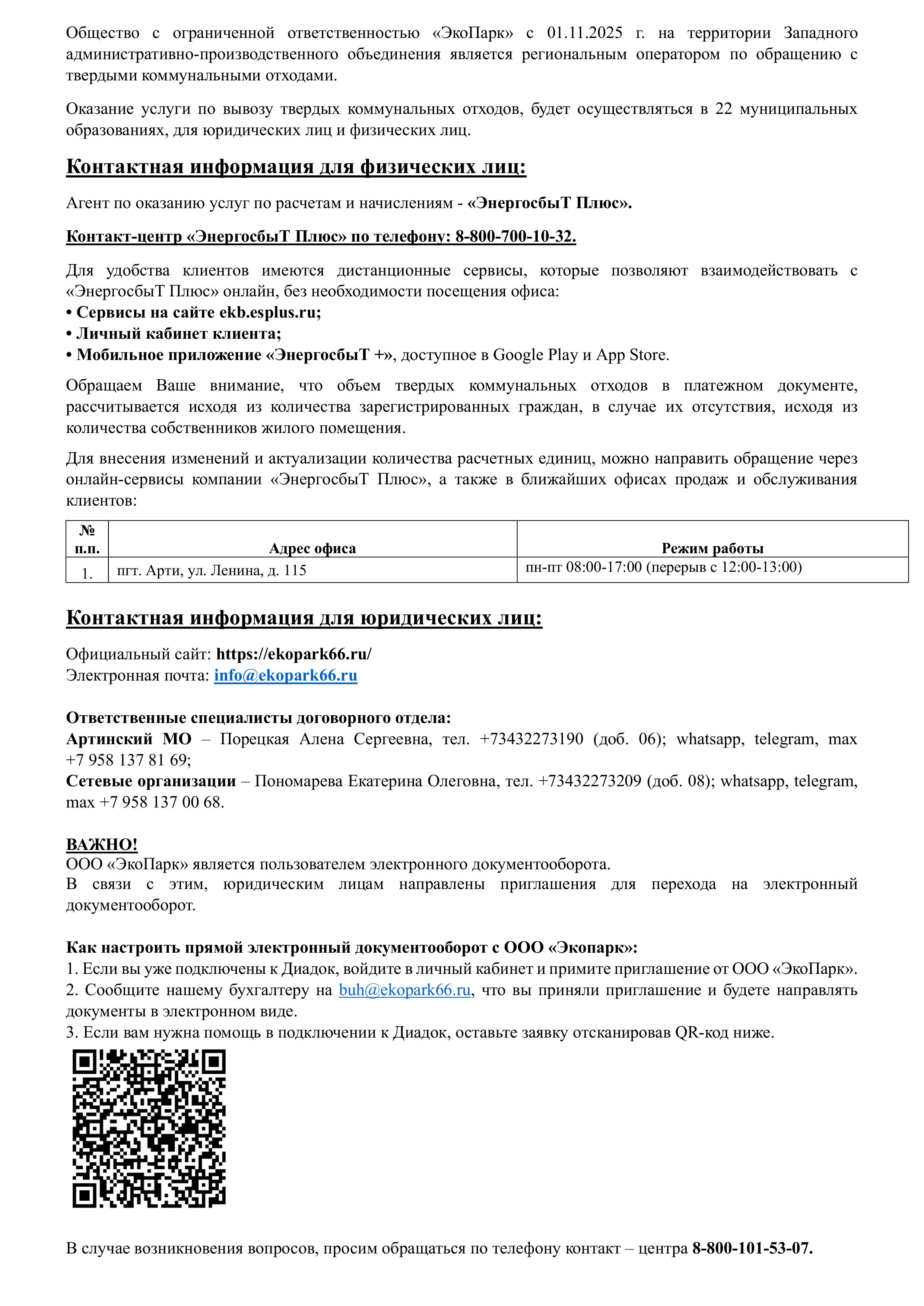 «ЭкоПарк» с 01.11.2025 г. на территории Западного административно-производственного объединения является региональным оператором по обращению с ТКО