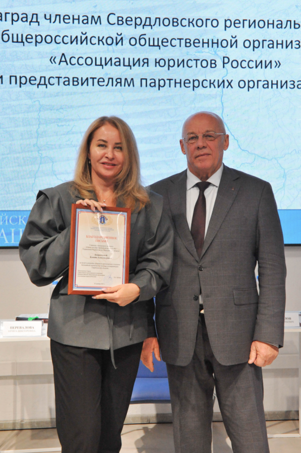 За вклад в развитие правового просвещения и активное участие в оказании бесплатной юридической помощи гражданам на территории Свердловской области К.А. Бояринцева была удостоена благодарственного письма Ассоциации. Почётную награду от имени регионального отделения вручил председатель его Совета, Владимир Александрович Бублик.