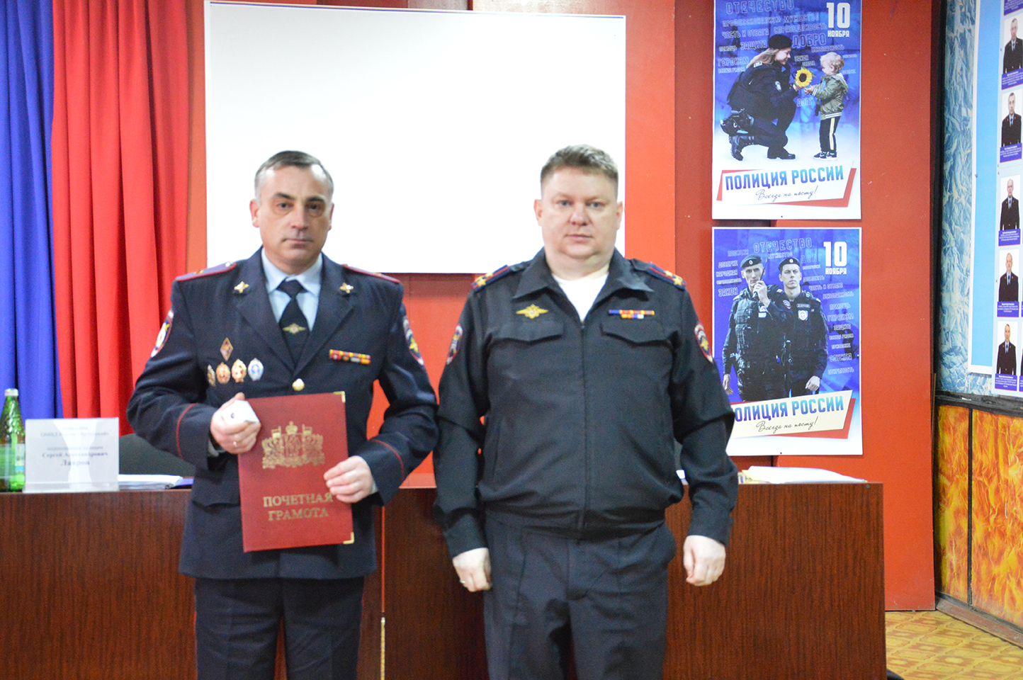 Перед началом совещания, полковник полиции Алексей Викторович вручил Почетную грамоту Губернатора Свердловской области начальнику отделения дознания ОМВД майору полиции Эдуарду Котову, за добросовестное исполнение должностных обязанностей, пожелав дальнейших успехов в службе.