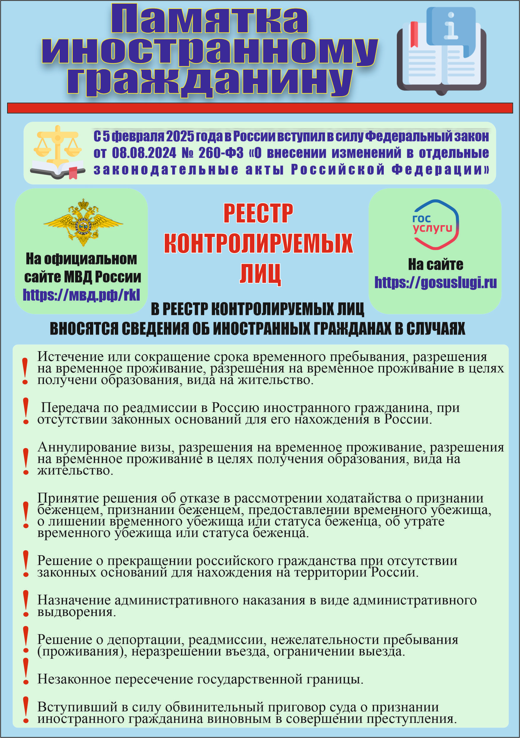 С 5 февраля 2025 года граждане и юридические лица (в том числе работодатели) могут проверить наличие сведений об иностранном гражданине в реестре в формате «запрос-ответ» через интерактивную форму на официальном сайте МВД России и на Едином портале государственных и муниципальных услуг (функций).
