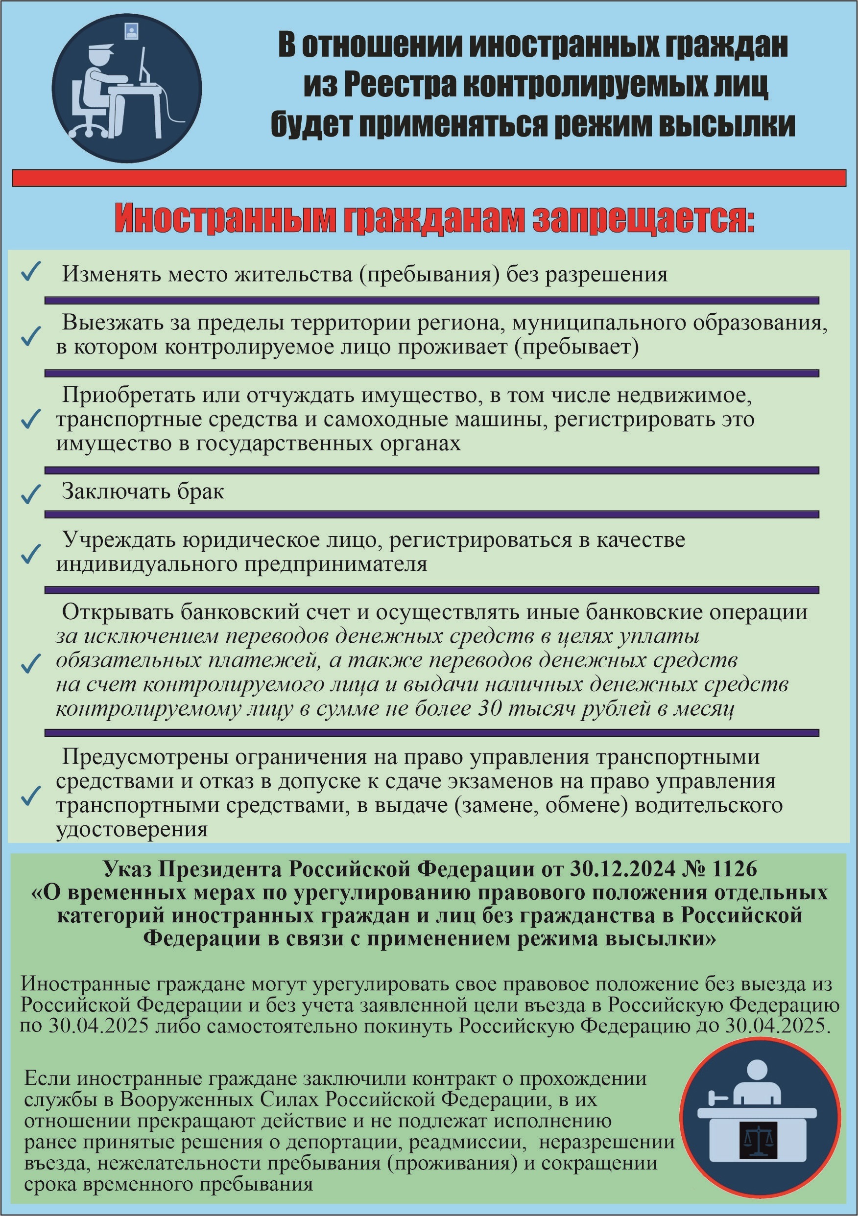 С 5 февраля 2025 года к иностранным гражданам, незаконно находящимся на территории Российской Федерации, будет применяться режим высылки, устанавливающий ограничения отдельных прав и свобод, а также иные меры федерального государственного контроля (надзора) в сфере миграции.