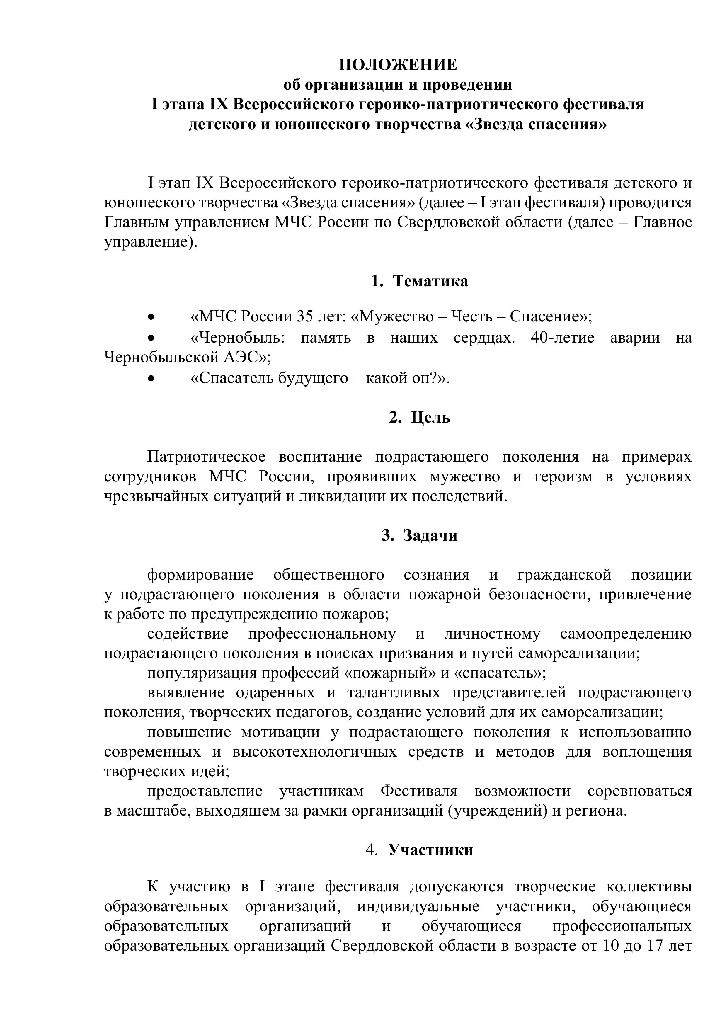 Главное управление Министерства Российской Федерации по делам гражданской обороны, чрезвычайным ситуациям и ликвидации последствий стихийных бедствий по Свердловской области совместно с Министерством общественной безопасности Свердловской области организует и проводит I этап IX Всероссийского героико-патриотического фестиваля детского и юношеского творчества «Звезда спасения»