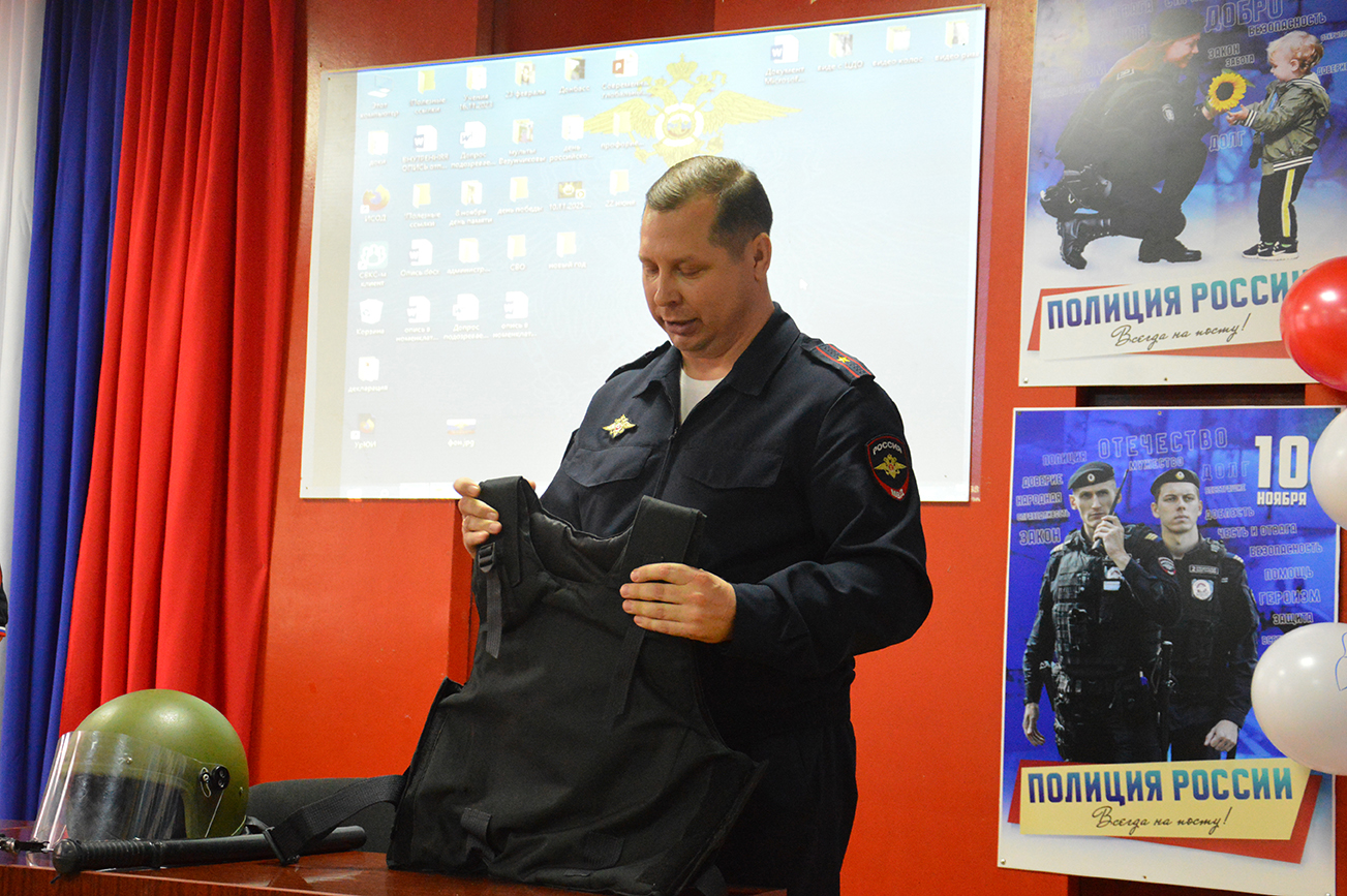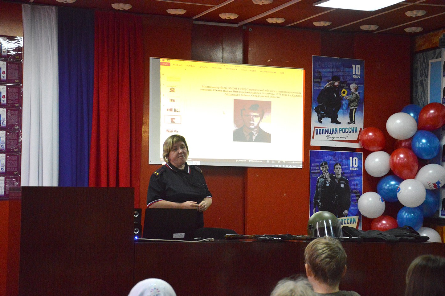 Школьникам рассказали о подвигах сотрудников полиции, отдавших свои жизни, выполняя служебный долг. Особое внимание было уделено памяти двух героев, чьи имена навсегда связаны с Артинской землей: Вадима Витальевича Панова из с. Сажино и Алексея Викторовича Жеребцова из с. Манчаж. Молодые ребята, служившие в Свердловском ОМОНе, погибли, защищая конституционный порядок на Северном Кавказе в Первую чеченскую войну.