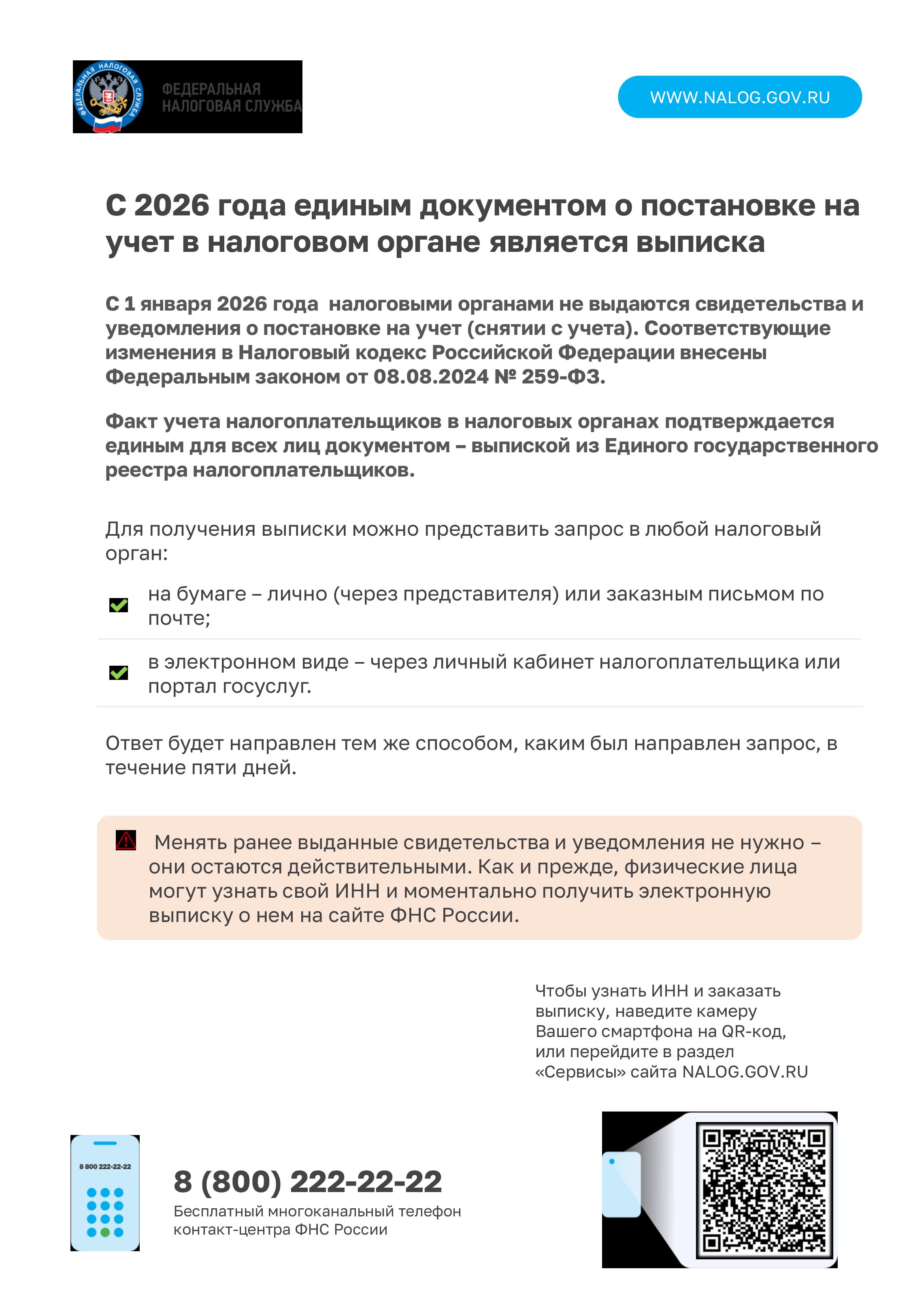 С 2026 года единым документом о постановке на учет в налоговом органе является выписка